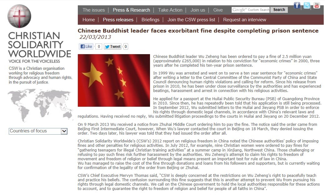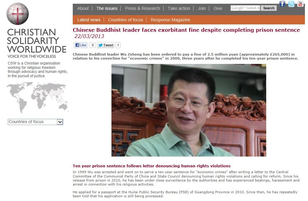 Chinese Buddhist leader faces exorbitant fine despite completing prison sentence  22/03/2013