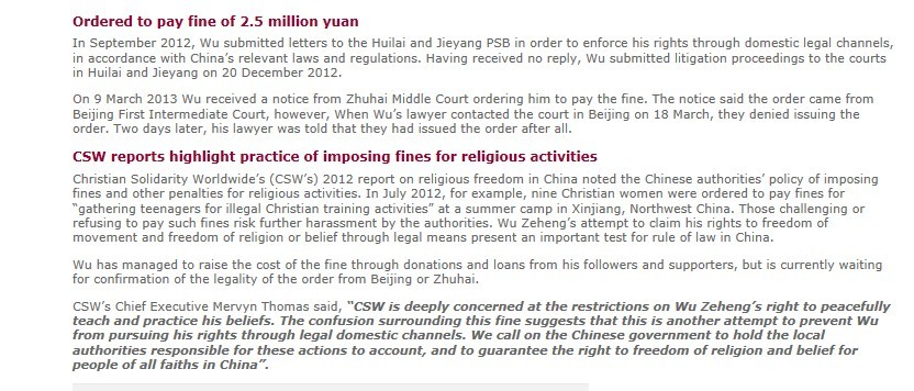 Christian Solidarity Worldwide’s (CSW’s) 2012 report on religious freedom in China noted the Chinese authorities’ policy of imposing fines and other penalties for religious activities. In July 2012, for example, nine Christian women were ordered to pay fines for “gathering teenagers for illegal Christian training activities” at a summer camp in Xinjiang, Northwest China. Those challenging or refusing to pay such fines risk further harassment by the authorities. Wu Zeheng’s attempt to claim his rights to freedom of movement and freedom of religion or belief through legal means present an important test for rule of law in China. Wu has managed to raise the cost of the fine through donations and loans from his followers and supporters, but is currently waiting for confirmation of the legality of the order from Beijing or Zhuhai.