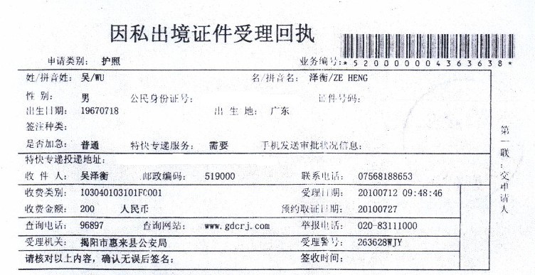 On July 12, 2010, Wu went to Hui-lai County Public Security Bureau in Jie-yang City of Guangzhou Province to apply for an ordinary passport and visa to Hong Kong/ Macau. The scheduled pickup dates were July 27, 2010, for the passport and August 2, 2010, but he has not yet heard any news from them.