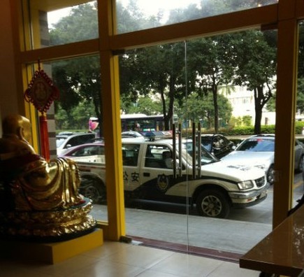 On December 6, 2012, Zhuhai local police, using the excuse of "illegal gatherings," entered Wu's Buddhist store without presenting any legal warrant. Not only did they check every visitor's ID, but they also parked their car in front of the store to discourage people from coming to the store.