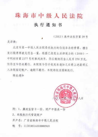 March 8th, 2013:  Wu received a court document from the Zhuhai Middle Court, stating the it received an order from Beijing Middle Court asking Wu to pay a fine of 2.5 million Yuan within 10 days of receiving the Court Notice, or the Court will take legal action and force Wu to do so. In this document, the Court said this was based on a prior case against Wu dating back to the year 2000 in which Wu was charged and convicted of “Economic Crimes.”