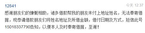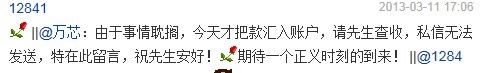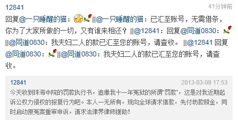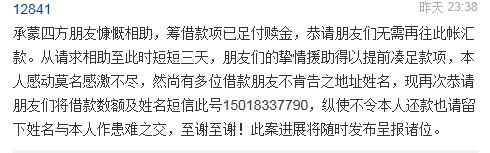 12841: Thanks to the generosity of friends from many places, I have raised enough money to pay for the fine. As such, there is no need to send money to this account anymore,. Given that it only took three days to raise the money, I feel overwhelmed by your support and am immensely grateful. Although many who loaned me the money refused to tell me your name and addresses, please do so in order to me to repay the money to you in the future. Send me your information to by text message to the number 15018337790. Even if you do not wish to be repaid, I would like to be able to update you on the status of my case which I will report to you soon.