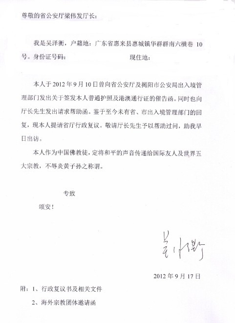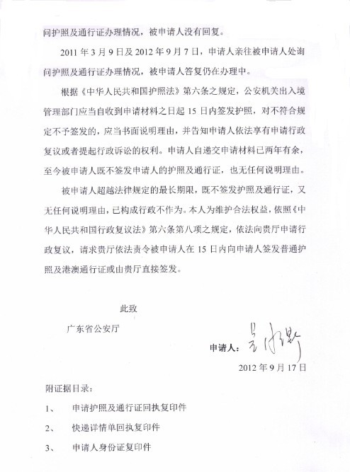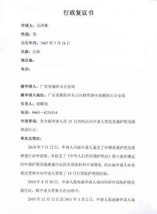 On September 10, 2012, I sent a summon letter to the Guangdong Public Security Bureau and Entry–Exit Administration Department of Jie-yang Public Security Bureau in regard to the issuance of my ordinary passport and pass for Hong Kong/Macau. At the same time, I sent you, Mr. Director, a letter to request for help. Because I did not receive any response from the Entry–Exit Administration Department or Bureau, I hereby am sending a request for an Application for Administrative Reconsideration. I would be greatly appreciative if, Mr. Director, you could take this issue into favorable consideration and process my application on time in order to support my overseas visits.